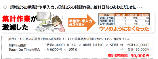 Touch on Time打刻をするだけで「就業時間」「残業時間」「遅刻時間」等の勤怠情報が瞬時に計算されます。毎月の勤怠集計に費やしていた時間の削減に寄与します。