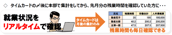 Touch on Timeはクラウド型サービスの為リアルタイムで勤怠の状況を把握することができます。これにより月途中で残業時間や人件費のチェックが可能になります。