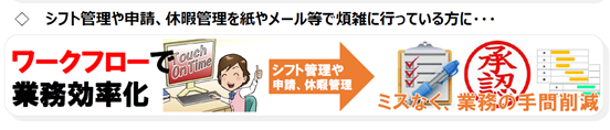 Touch on Timeでは従業員一人一人にマイページが配布されます。そのマイページより「シフト(有給)」「残業承認」「打刻修正」の申請が行え、その承認も管理者のマイページから完全オンラインで行えます。